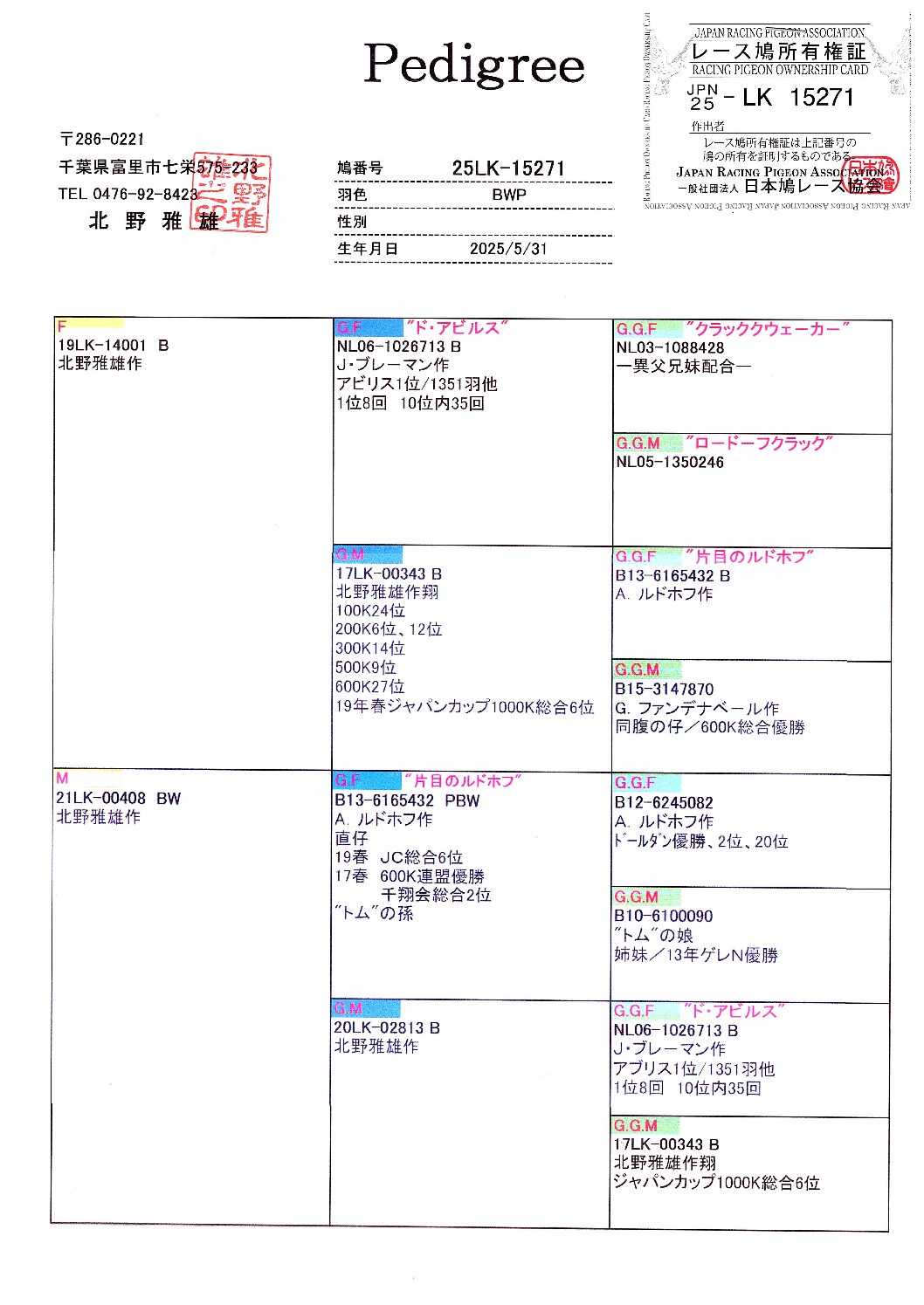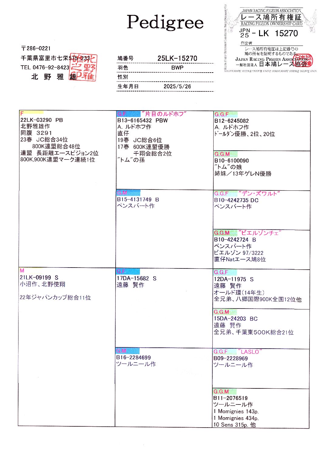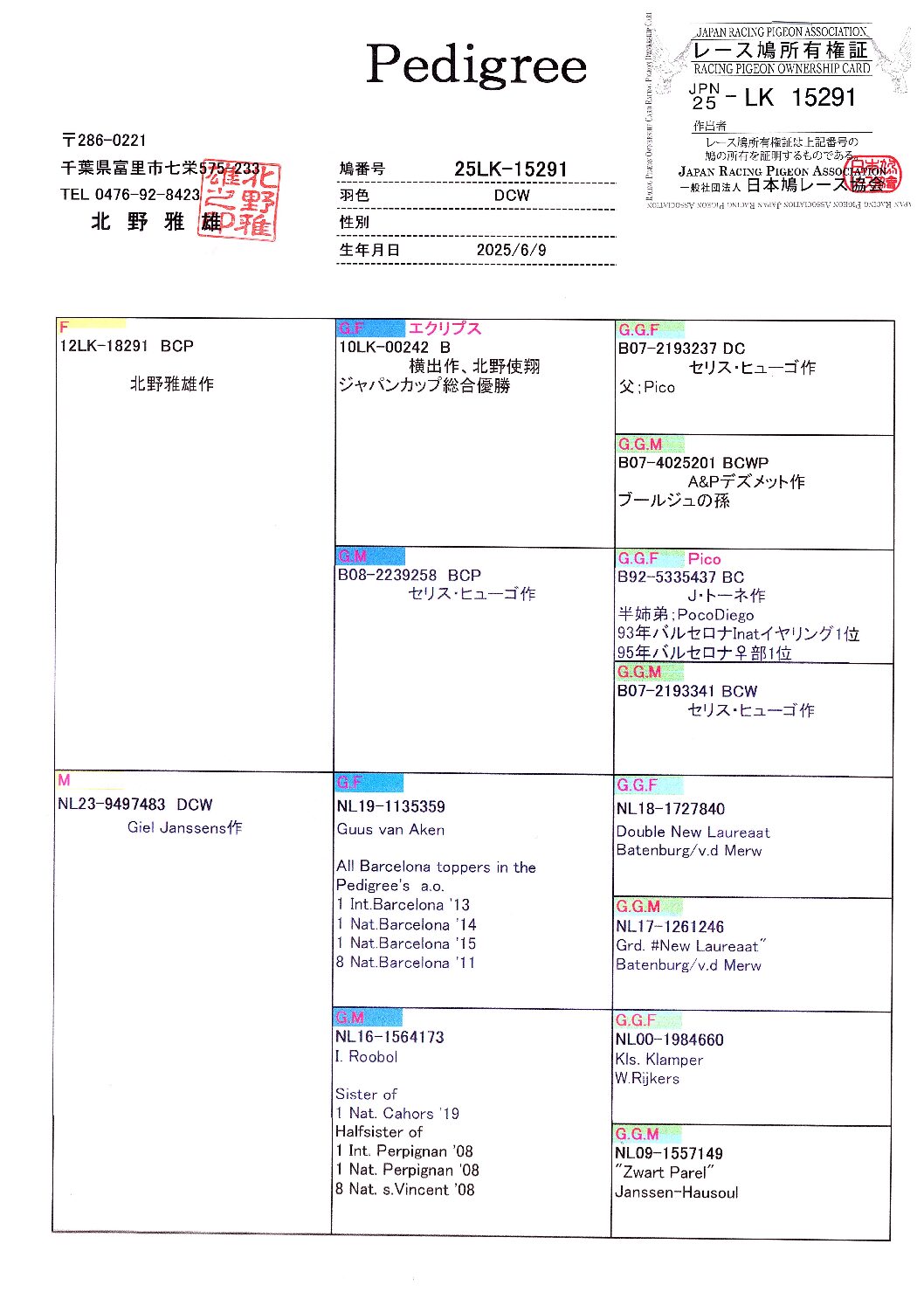 Giel Janssens NL23-9497483 北野鳩舎種鳩