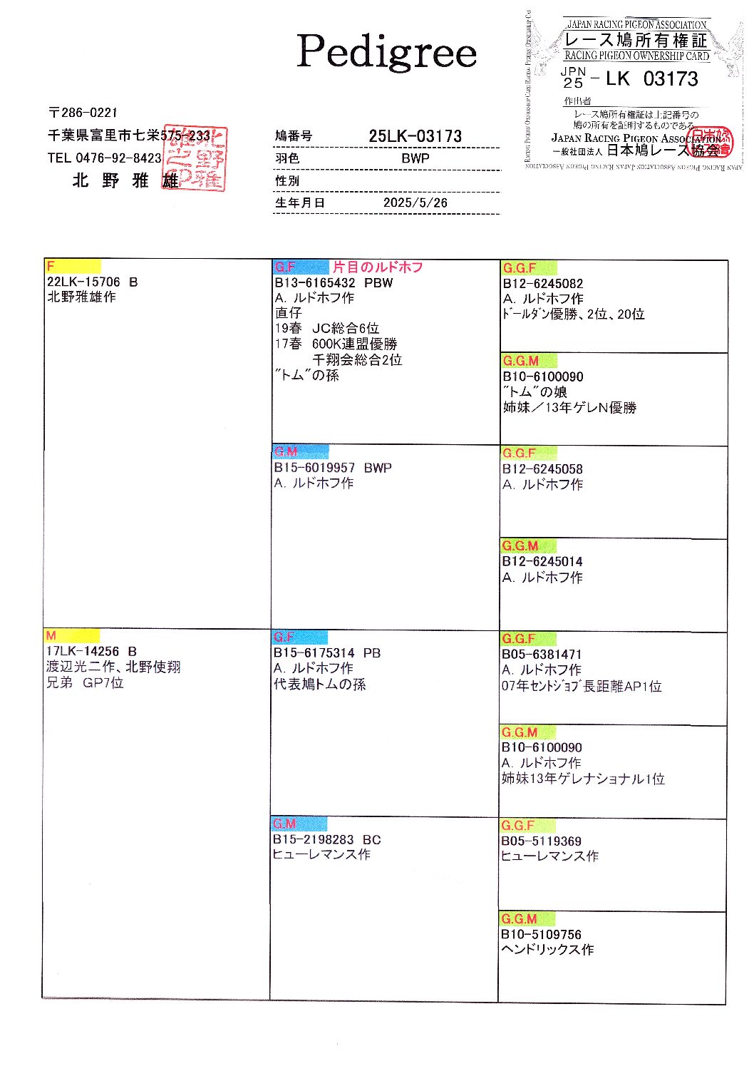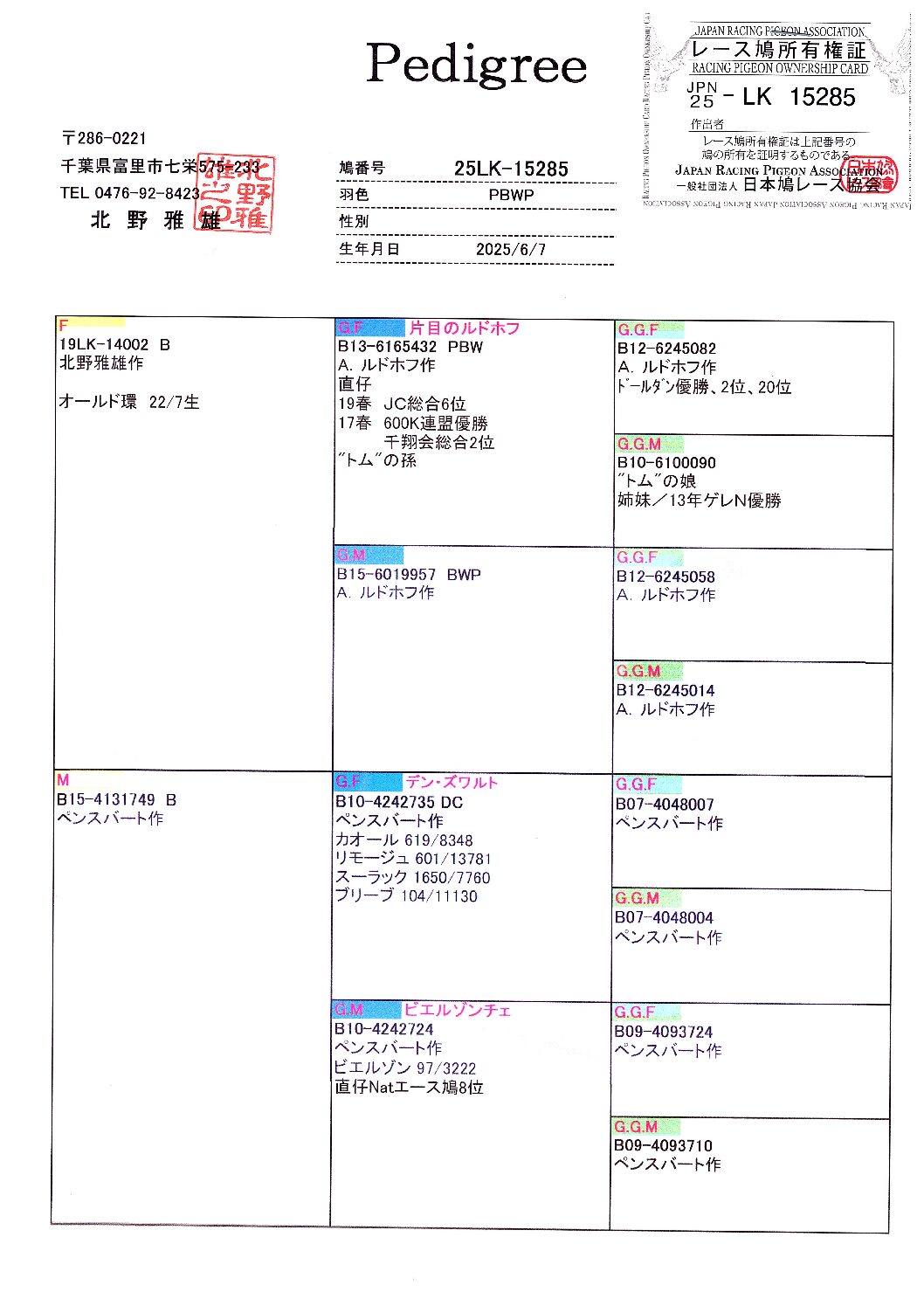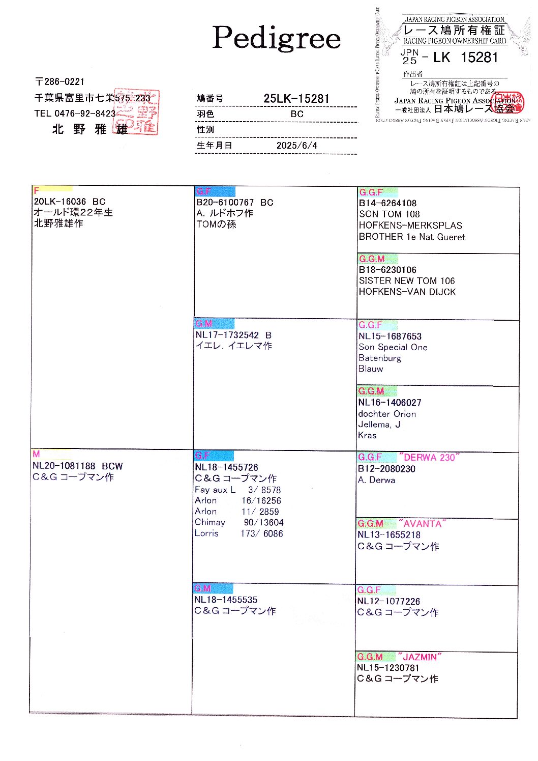Giel Janssens NL23-9497483 北野鳩舎種鳩